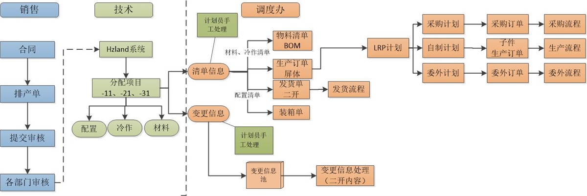 3)銷售到設(shè)計(jì):通過(guò)客戶自己的hzland系統(tǒng),對(duì)客戶訂單進(jìn)行設(shè)計(jì)生產(chǎn),拆分成配置清單、冷作清單、材料清單;
