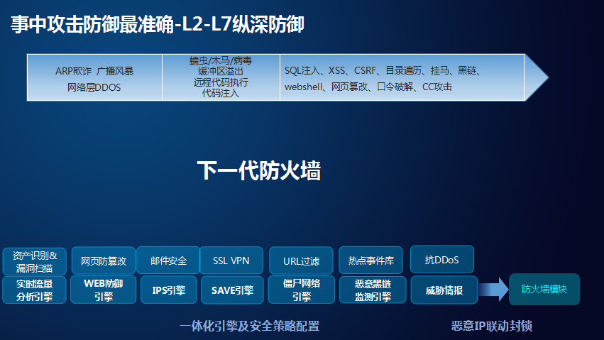在互聯網出口和服務器數據中心區域部署下一代防火墻,提供漏洞防護,木馬病毒等惡意軟件的過濾,僵尸網絡和DDOS攻擊檢測,過濾網絡層和應用層的威脅流量,防止威脅攻擊橫向傳播,保護重要業務系統,并對安全域間的威脅進行檢測和保護。
